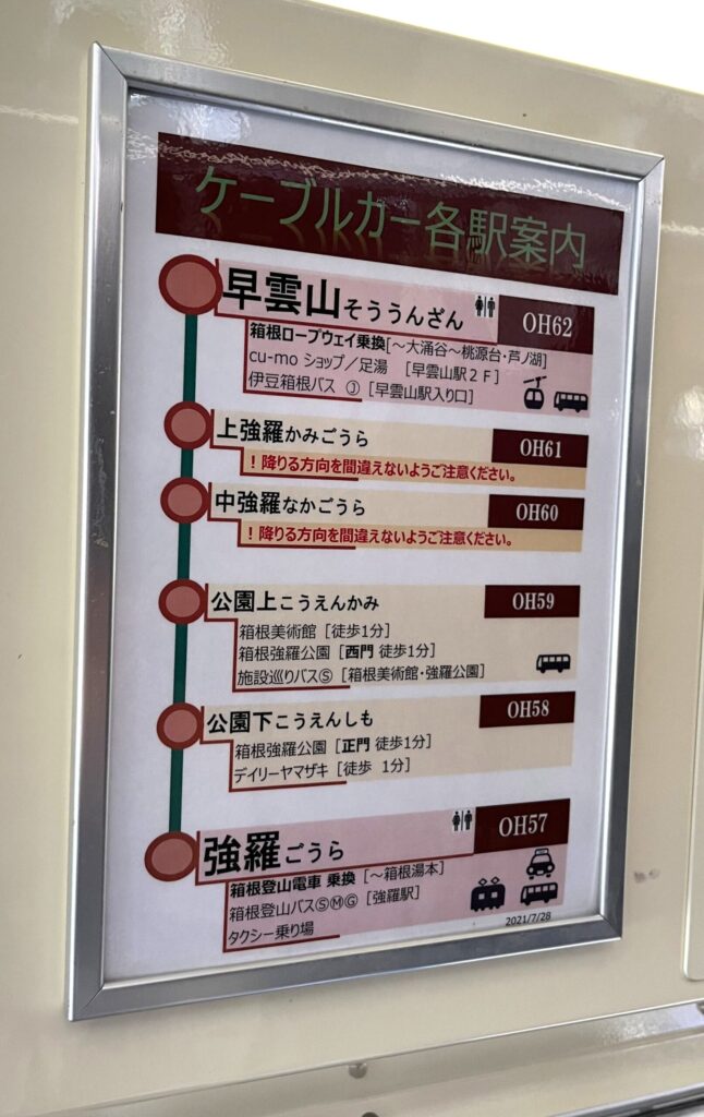 私たちのルートは、「箱根湯本駅」から『箱根登山電車』に乗って「強羅駅」へ。「強羅駅」から『箱根登山ケーブルカー』で「早雲山駅」へ。「早雲山駅」から『箱根ロープウェイ』で「大涌谷駅」へ。というものでした。