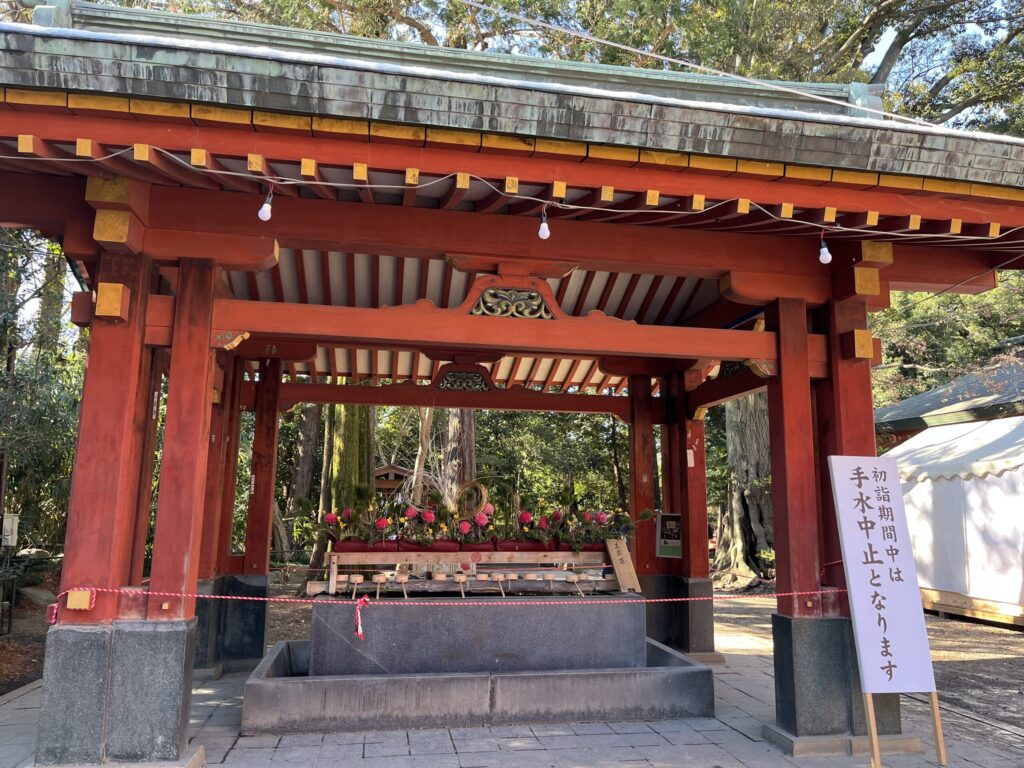 手水のところは、お正月らしいお花で飾られていました。